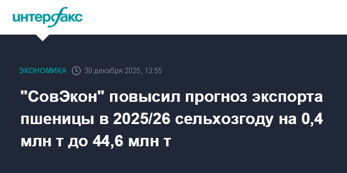 Moscow, 30 December — SovEcon has raised its forecast for Russian wheat exports in the 2025/26 agricultural year (July–June) by 0.4 million tonnes to 44.6 million tonnes. The company cited exceptionally strong shipments in recent months and an improvement in export margins as the principal reasons for the upward revision.