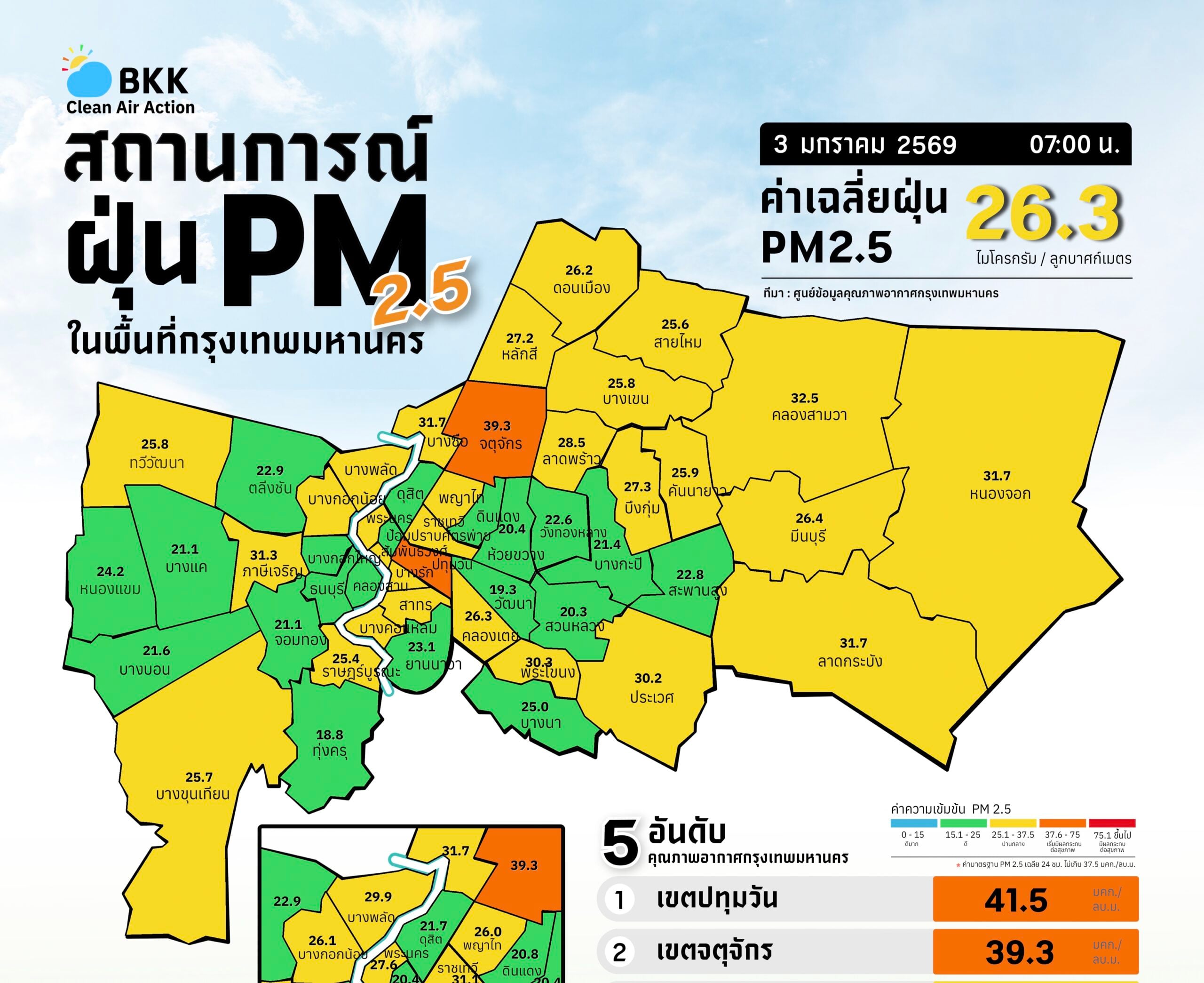 Bangkok’s air quality monitoring network recorded elevated fine particulate levels on the morning of 3 January, with two central districts exceeding the health-based 24-hour standard. The citywide 24-hour PM2.5 average was 26.3 micrograms per cubic metre (µg/m³), but readings ranged from 18.4 to 41.1 µg/m³ across monitoring stations.
