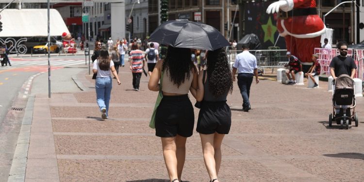 SP - CLIMA/SP/CALOR - GERAL - Pedestres enfrentam sol e calor no Viaduto do Chá, no centro de São Paulo, nesta segunda-feira, 22. Com a chegada do verão, a região Sudeste do país terá tempo mais seco, com o sol aparecendo todos os dias nessa semana e poucas condições de chuva. Na capital paulista deve ter recorde de calor nesta semana, de acordo com o Climatempo. 22/12/2025 - Foto: RENATO S. CERQUEIRA/ATO PRESS/ESTADÃO CONTEÚDO