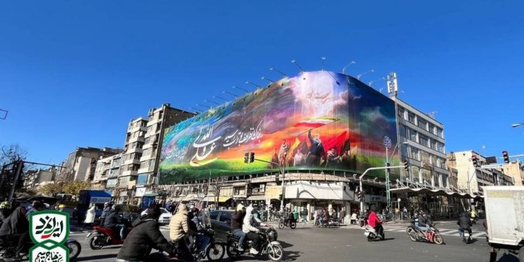 A large digital mural titled “Iran Ali” by artist Hassan Rouh‑ol‑Amin was unveiled this week at the busy intersection of Vali Asr and Jomhuri streets in central Tehran, Mehr News reported. The work, produced in the Maktab Haj Qassem, was revealed to passersby in a public ceremony attended by local officials and residents.