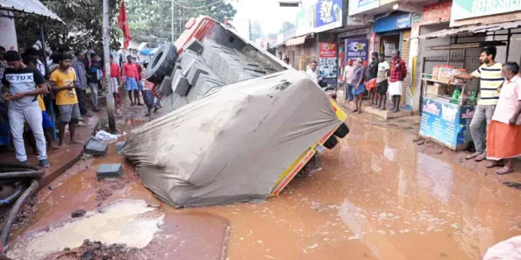 The accident occurred at around 8am when the tipper lorry was negotiating the stretch of road where workers had dug a trench to lay an electrical cable for a national highway project. Locals and officials say the trench had been covered with soil without informing the local water authority. When water authority staff later opened a valve to supply water to Mayyanad, the broken pipe caused water to gush into the trench and across the road, undermining the ground beneath the vehicle.